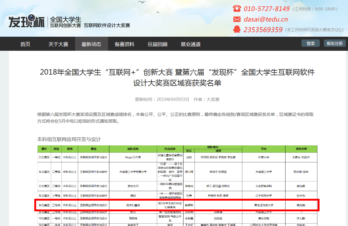 4月3日,全国大学生“互联网+”创新大赛暨第六届“发现杯”全国大学生互联网软件设计大奖赛公布获奖名单,江南电子网站(中国)官方网站国际教育学院中加合作办学计算机科学与技术专业 2016级韩福昕同学获得东北赛区本科组互联网应用开发与设计三等奖。