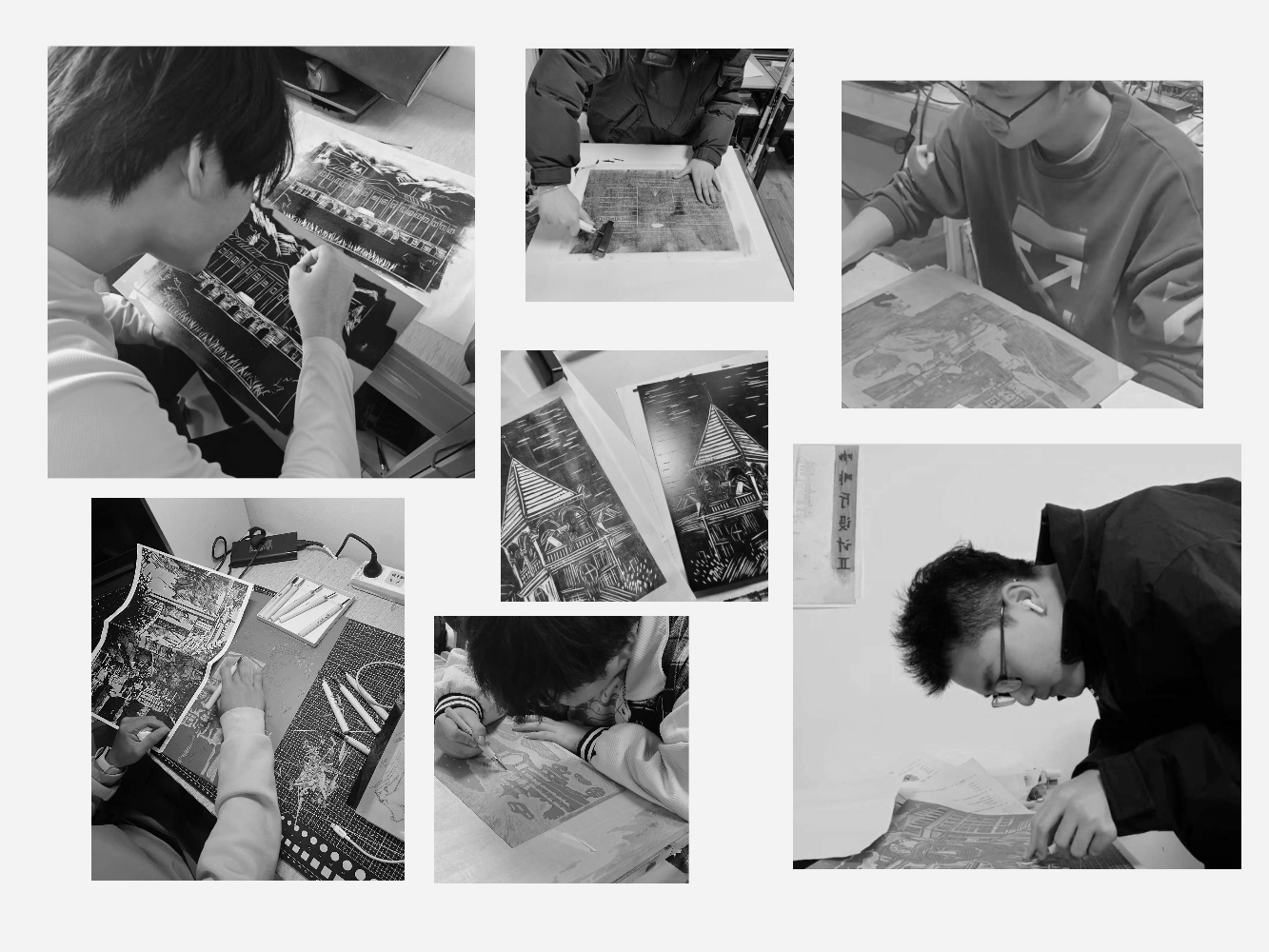 这些版画作品以黑白两色为基调,笔触鲜活,画面主次分明,精炼概括,聚焦于建校以来无数个珍贵瞬间,展现了学校77年发展建设的历史变迁与峥嵘岁月,凝结着学校的历史之美、发展之美、人文之美。创作中,学生们通过回顾学校与祖国共命运、与时代同发展的历史,沉浸式感受学校的壮阔历程和辉煌成就,向我们缓缓铺开一幅属于黑江南电子网站(中国)官方网站的时光画卷。他们将自己对学校发展历程的点滴感悟融入作品创作中,用艺术的形式表达了对学校深沉的热爱之情与无比的自豪之感。