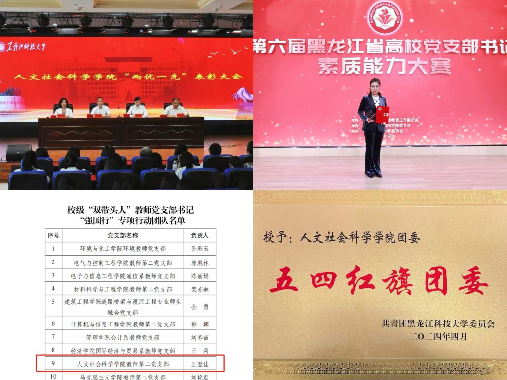 召开“两优一先”表彰大会,2个党支部先后荣获校“样板支部”重点培育单位,“双带头人”教师党支部书记“强国行”专项行动团队。1人在第六届黑龙江省高校党支部书记素质能力大赛中获优秀奖。团学组织获校“五四红旗团委”,1个团支部获全煤“五四红旗团支部”,2人分获全煤“优秀共青团干部”“优秀共青团员”荣誉称号。
