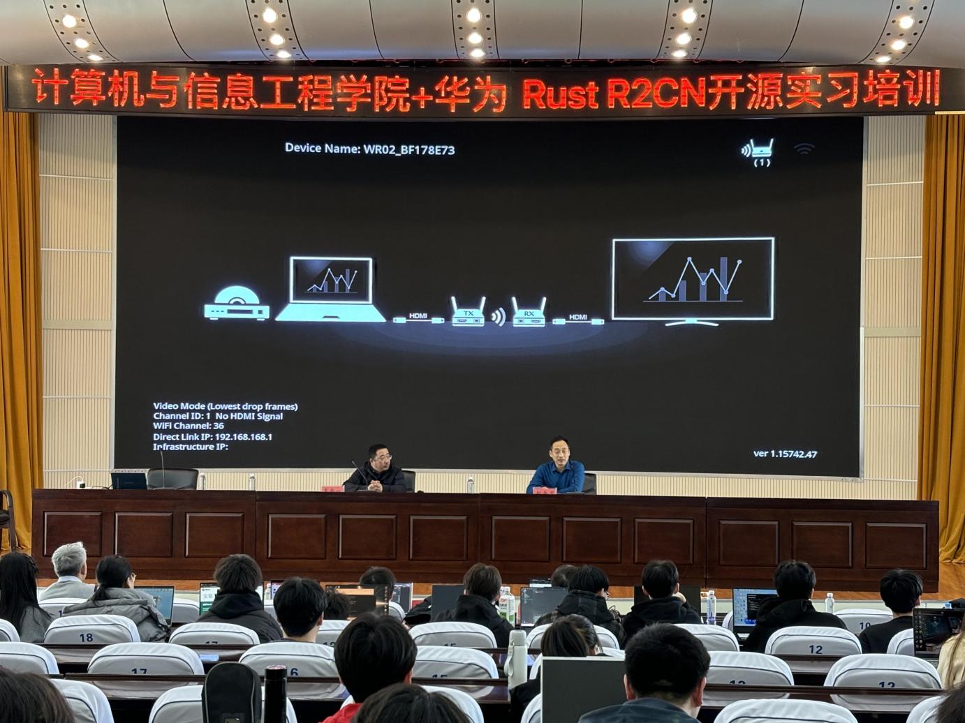 培训期间,马全一教授凭借其深厚的技术功底与丰富的行业经验,深入浅出地讲解了RISC-V架构以及Rust语言在云原生领域的关键应用,为学生们勾勒出该领域的前沿技术蓝图。华为高级工程师王齐林、李征、王鹭星、陈硕分别围绕《Rust特点简介》《Rust全球生态》《Rust在中国的发展》《Rust编程语言语法简介》《Rust—项目实战编程》等专题进行了培训。培训从不同技术维度,通过案例分析、现场演示、学生实操等方式,让学生们真切感受到企业实际开发流程与高校理论教学的联系。学生们学习热情高涨。在答疑环节,学生们就技术细节、职业发展等方面提出诸多问题,专家团队均给予耐心且专业的解答。