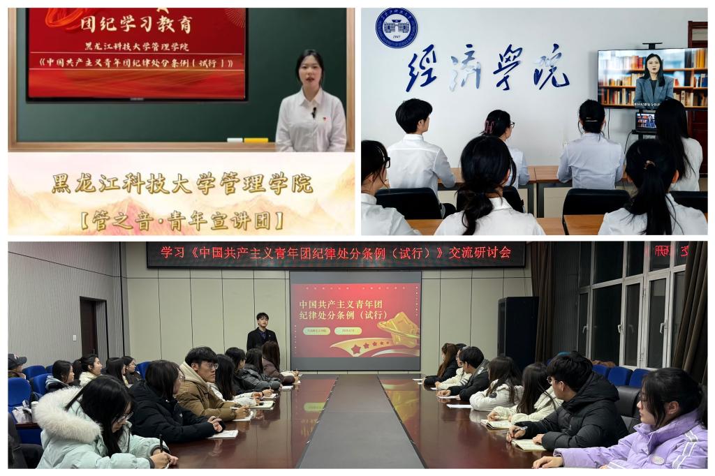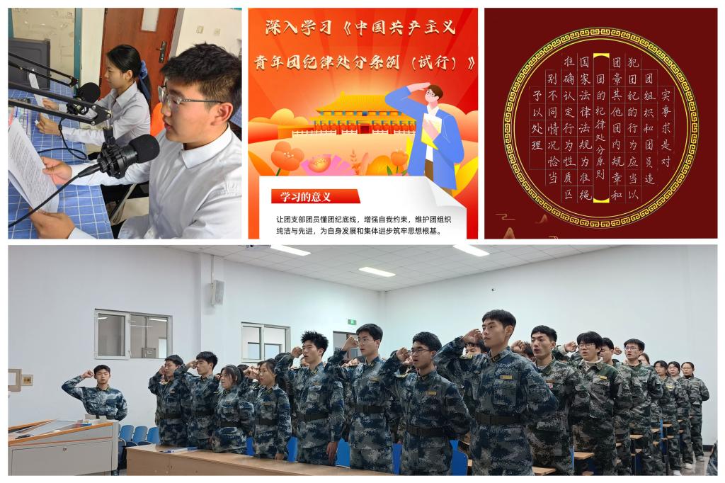 校青年传媒中心团支部设计制作《中国共产主义青年团纪律处分条例(试行)》海报,号召青年学生深入学习团的纪律,争做严格遵规守纪的模范。飞跃之声广播电台团支部开辟《中国共产主义青年团纪律处分条例(试行)》学习专栏,通过校园广播电台对《条例》内容进行播报。人文学院团委组织青年学生编撰形成个人学习手账,逐字逐句地反复研学《条例》内容,不断加深对团纪条例的理解和认识。理学院团委、研究生学院团委、外国语学院团委、大学生仪仗队团支部在团日活动中以重温入团誓词、共唱团歌的形式,不断增强广大团员青年的归属感与使命感。