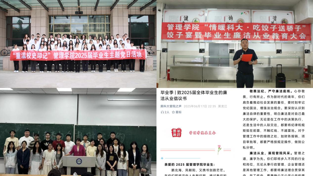 铸魂育人,培根固本,筑牢青春理想之基。管理学院以习近平新时代中国特色社会主义思想为指引,持续强化对学生的思想引领。通过历史场景激发情感共鸣,在校史馆开展了行走的党课——“重温校史印记”2025届毕业生主题党日活动,以校史中的红色基因滋养初心,用爱校荣校的实际行动筑牢思想根基,让青春在传承母校精神中绽放信仰之光;以“管院之声”微信平台《廉洁从业倡议书》传递廉洁初心,用毕业生廉洁从业教育大会筑牢从业底线,让毕业季的廉洁清风伴随全体毕业生在新征程上书写无愧于时代的青春答卷;毕业班辅导员、班主任开展毕业生主题班会团活,回首求学路,共话新征程,带着母校赋予的底气和力量,将“小我”融入“大我”,让青春在党和人民最需要的地方绽放绚丽之花。
