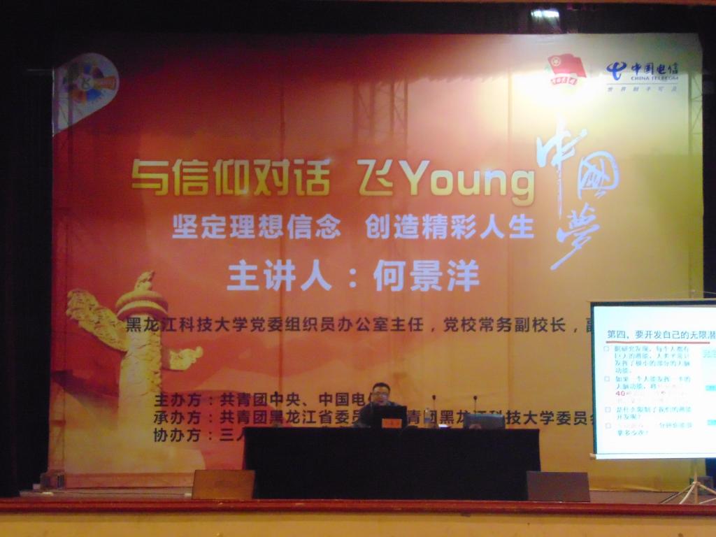 据悉,作为全团深入开展“我的中国梦”主题教育实践活动的重点工作项目,团中央于2013年5月至12月在全国高校开展“与信仰对话,飞Young中国梦”主题讲座活动,各级总场次在5000场以上,其中,团中央联合中国电信集团举办重点主题讲座100场,本场讲座是团中央在黑龙江省安排的4场讲座之一。校团委也将通过业余团校、“青马工程”大学生骨干培训班、思想的声音专家讲坛等有效载体,继续开展“与信仰对话”系列活动,帮助同学们在正确认识个人梦想和民族梦想关系的基础上,奋发图强、不懈奋斗,用青年个人梦想的实现,托举起中华民族伟大的复兴之梦。