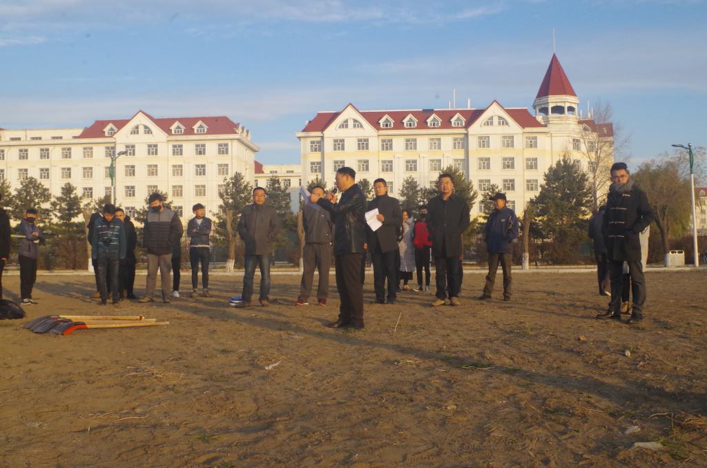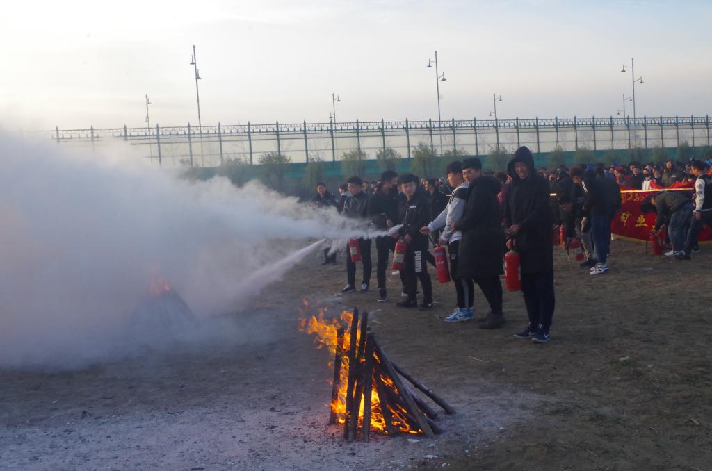 在安全疏散地点清点人数无误后,主要学生干部和2017级全体学生参加了在篮球场旁组织的灭火实战演习,演习由辅导员徐龙主持。首先,保卫处赵铁山老师讲解了灭火器的正确使用方法以及日常寝室用电的安全注意事项。随后,学院领导、老师以及各班学生代表上前实际操作了灭火器。