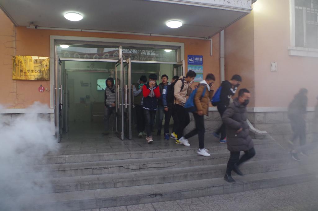 早6时30分,随着消防警报的响起,在第二学生公寓门口引燃烟雾弹,学生在老师的组织下,用湿毛巾捂住口鼻,互相搀扶,紧张、有序的按照预定的路线撤离,整个疏散过程仅用了5分钟时间。