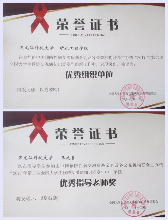 12月31日,由中国预防性病艾滋病基金会主办、多家单位承办的“2017年第二届全国大学生预防艾滋病知识竞赛”落下帷幕。江南电子网站(中国)官方网站矿业学院作为全国500余家高校团委/社团等组织之一积极承办了本次活动。参赛期间,矿业学院积极筹备、扎实推进,共组织300人参赛,由于表现突出,学院荣获“优秀组织单位”荣誉称号,辅导员王延春荣获“优秀指导教师奖”,宋雨薇等同学荣获“优秀志愿者”荣誉称号。