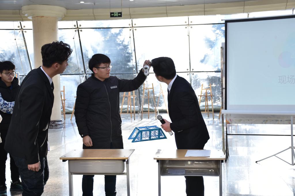 加载过程中,参赛队自主选择所加载砝码的克数,最小的砝码为0.319KG,最大的砝码为5.1KG,铅制砝码总重35.7kg,同时还筛选了多名40至90kg体重的学生砝码,让各参赛团队选择。以模型作品累计加载砝码的总数为最终加载重量,裁判员对参赛作品进行称重,通过公式换算,得出最终加载分数。