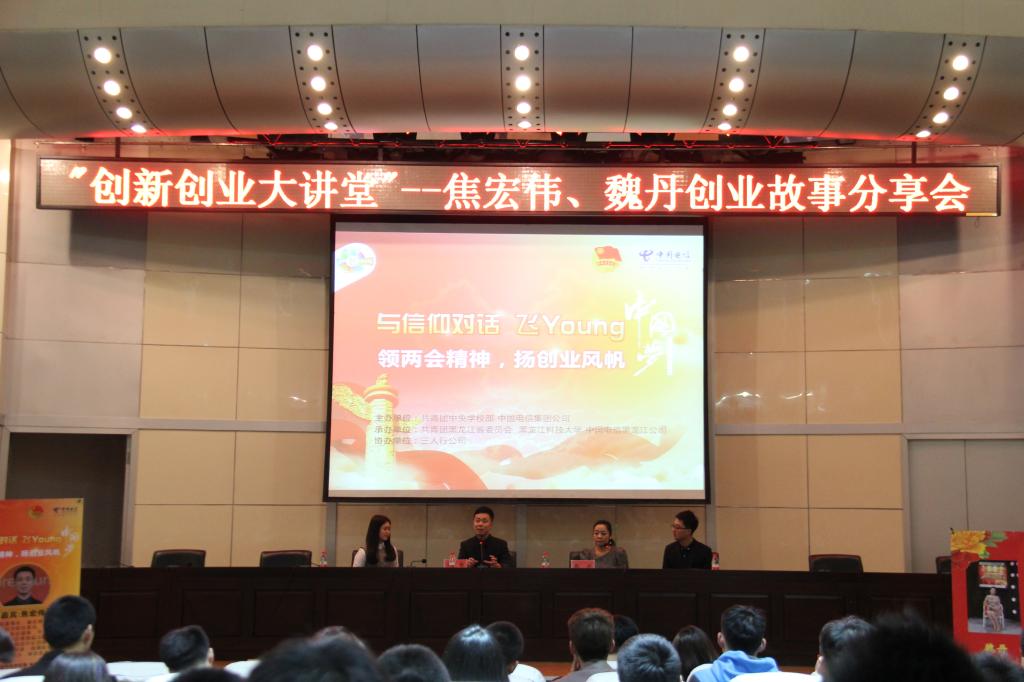 近日,李克强总理在两会上又强调“把大众创业、万众创新调动起来”。大众“创业潮”契合政府经济转型的“创新潮”,共同汇聚成一股充满活力的时代洪流。为积极引导青年学生自主创业,在大众“创业潮”中实现自身价值,成功创业、就业,3月26日晚在江南电子网站(中国)官方网站信息报告大厅举办了以“领两会精神,扬创业风帆”为主题的第四十期“黑眼睛”文化沙龙。特邀黑龙江省著名青年企业家焦宏伟、智联招聘哈尔滨分公司公共关系经理魏丹来到江南电子网站(中国)官方网站,与青年学生一起分享奋斗经历及宝贵经验。校团委全体成员及江南电子网站(中国)官方网站300余名青年学生参加了本次沙龙。