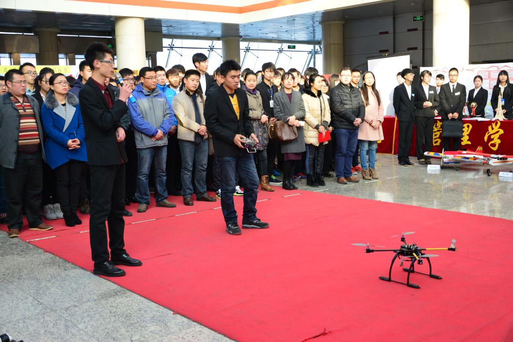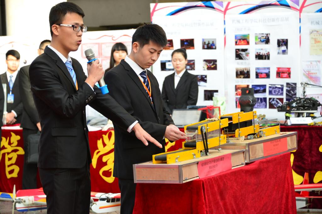 矿业工程学院学生实践获奖作品《底部移动式水平煤仓演示模型》、机械工程学院科技团队创新作品《四轴飞行器》、电气与控制工程学院科技创新竞赛获奖作品《仿生机械人》、建筑工程学院科研立项优秀作品《糖厂街道路景观设计长卷》四项优秀作品代表进行了现场展示。
