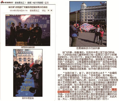 此次活动分为两部分,第一部分为:远离孤独,放飞梦想——志愿者陪自闭症儿童“放风筝”活动,伴着孩子们纯真的笑容,志愿者们放起了一个又一个爱心风筝;第二部分:让爱温暖“来自星星的你”——自闭儿童关爱周启动仪式。活动中,哈尔滨市残联副理事长杜仲等领导一起启动哈尔滨市自闭症关爱服务周启动球,并呼吁全社会积极行动起来,给予自闭症儿童更多关爱,让他们早日走出“自己那个狭小的世界”并走进色彩斑斓的世界。活动现场,哈尔滨医江南电子网站(中国)官方网站学专家为自闭症儿童进行了咨询和解答,江南电子网站(中国)官方网站则展出了以志愿者们用心绘出的关爱自闭儿童的作品,醒目的内容被媒体与行人关注,以此号召更多的人参与到关爱自闭儿童的行列。