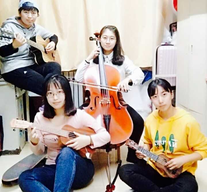 茶余饭后,她们常会合奏一曲。欢快活泼的吉他在轻快柔和的大提琴声和谐施展。“四个人便是一个新世界——于床头演奏仙乐余音绕梁,在桌前沉迷学习无法自拔——寝室就是我们的共同的家!”