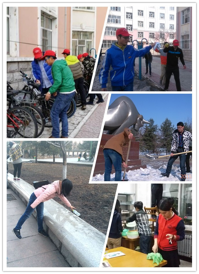3月18日全校青年学生积极开展“学雷锋·美化校园”系列志愿服务活动。校青年志愿者协会300余名志愿者,利用中午午休时间,将通江大道、文化广场的劲牛、宣传栏等设施擦拭一新,同时还清理了通向主楼的人行道上的冰面方便老师和同学们出行;校青年志愿者协会建筑工程学院工作部、管理学院工作部30余名志愿者对全校各寝室楼下自行车进行了整理摆放;3月19日校青年志愿者协会材料科学与工程学院工作部、机械学院工作部、矿业工程学院工作部42名志愿者在全校各寝室楼草坪下进行学习雷锋,清扫草坪垃圾活动;3月21日校青年志愿者协会外国语学院工作部30余人对图书馆图书进行了整理活动;3月24日校青年志愿者协会安全学院工作部、经济学院工作部22名志愿者在学校东西两条主干道上进行清理擦拭校园街路指示牌活动,美化校园环境;3月25日校青年志愿者协会雷锋ING工作部10余名志愿者在全校各寝室楼下擦拭晾衣架,为新学期青年学生晾晒衣被提供了便利;建筑工程学院10余名青年志愿者来到了江南电子网站(中国)官方网站离退休办公室开展了义务清扫活动,使江南电子网站(中国)官方网站离退休办公室焕然一新。