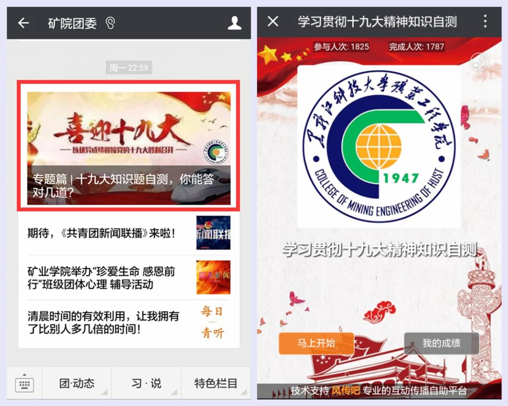 本次网络微答题活动利用手机媒体,依托学院“矿院团委”微信公众平台,采用线上答题的方式面向全院学生展开。在活动期内,答题者可以登陆“矿院团委”微信公众平台,点击活动专栏的链接,进入答题页面,页面上有自动生成的问答题目。经过前期充分宣传动员,参赛选手热情高涨,共计1800余人参与。试题内容丰富全面,主要涵盖了《党的十九大报告》、《中国共产党章程(修正案)》等内容。通过这种方式,大家可以利用休息时间,随时随地学习十九大精神,达到了“以考促学、以学促用”的良好效果。