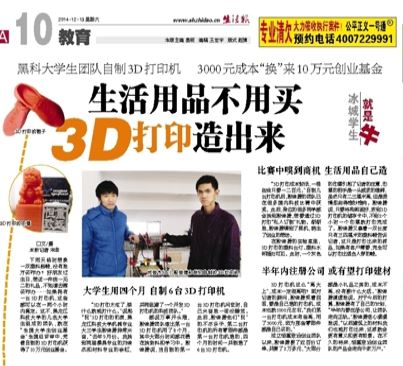12月13日,《生活报》10版教育版以《生活用品不用买 3D打印造出来》为题对江南电子网站(中国)官方网站恒重志远大学生创业团队进行报道,现将全文转发,以便学习交流。