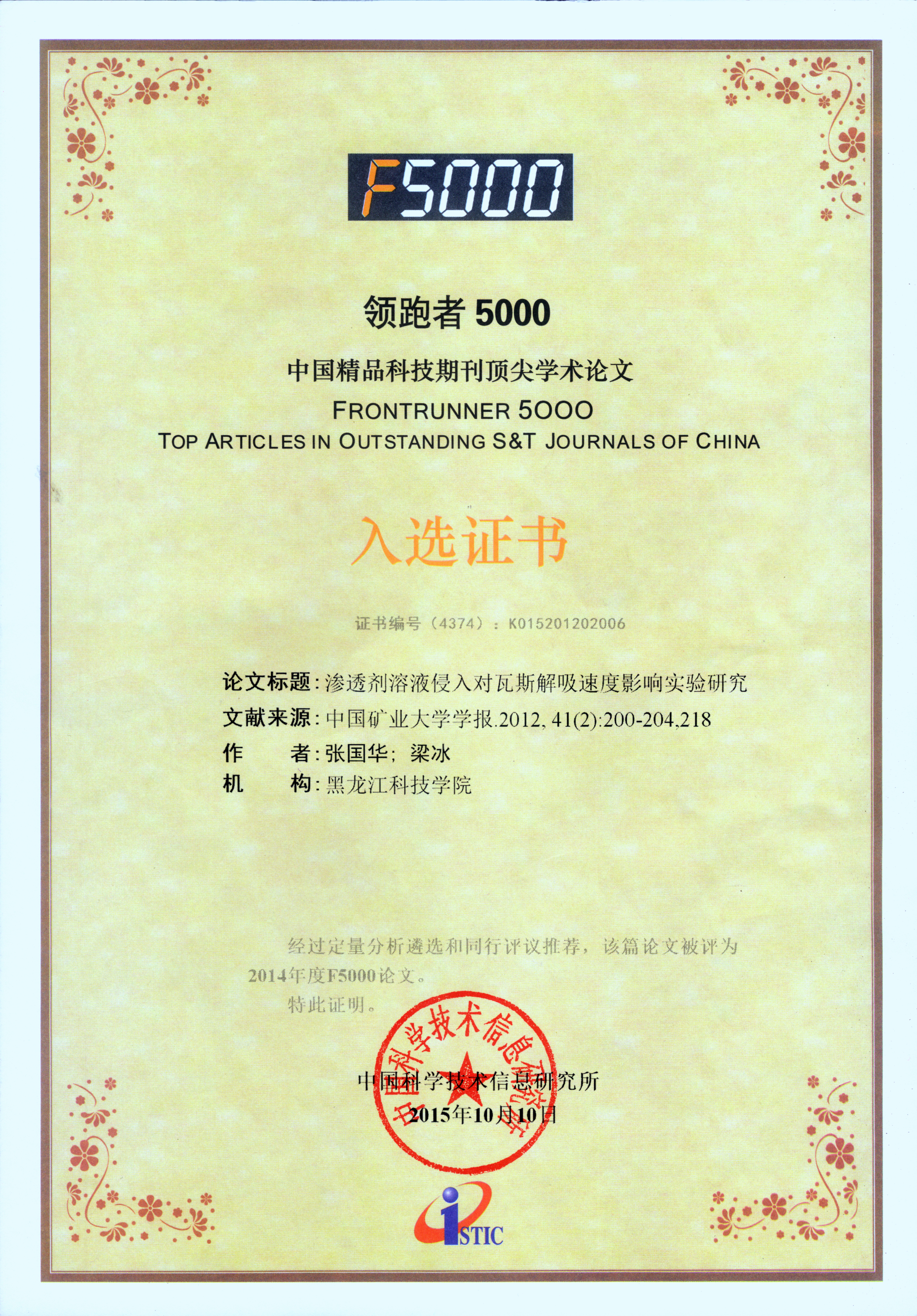 江南电子网站(中国)官方网站张国华教授发表在《中国矿业大学学报》上的《渗透剂溶液侵入对瓦斯解吸速度影响实验研究》一文,被评为2014年度F5000论文。
