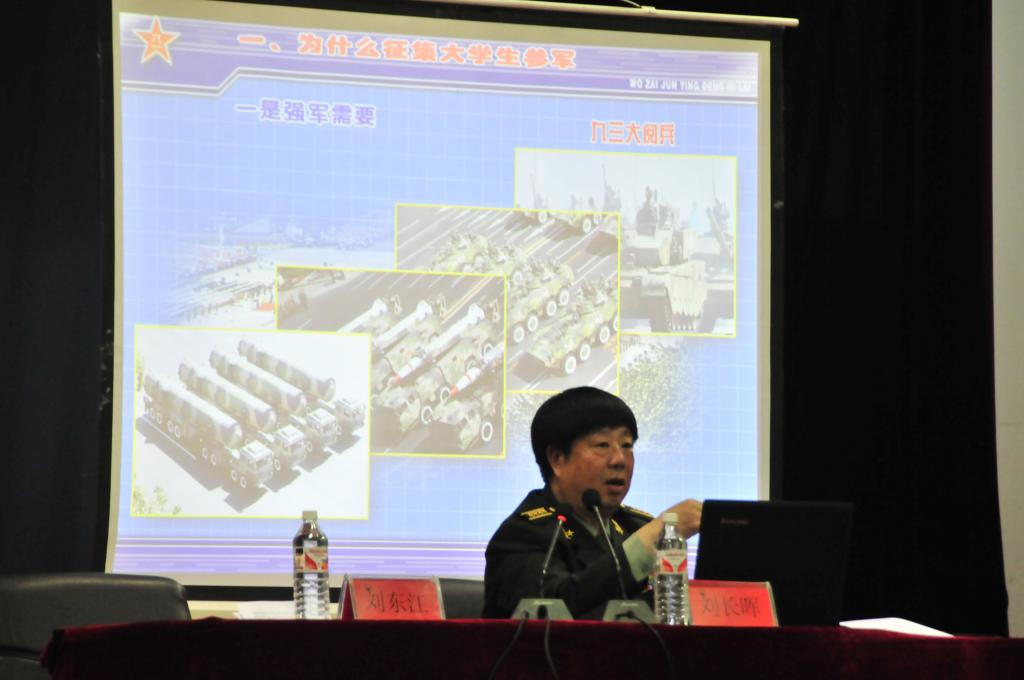 为贯彻落实全国大学生征兵工作会议精神,激发大学生参军入伍的积极性,5月5日下午14时,学校邀请黑龙江省大学生征兵宣讲团成员、省军区军训教研室刘长晖大校来江南电子网站(中国)官方网站进行了2017年征兵政策宣讲。校党委副书记张明华会前与宣讲团成员就江南电子网站(中国)官方网站大学生征兵事宜进行了交流。全体学生工作干部和1000余名大学生参加了宣讲报告会。宣讲报告会由武装部部长刘东江主持。