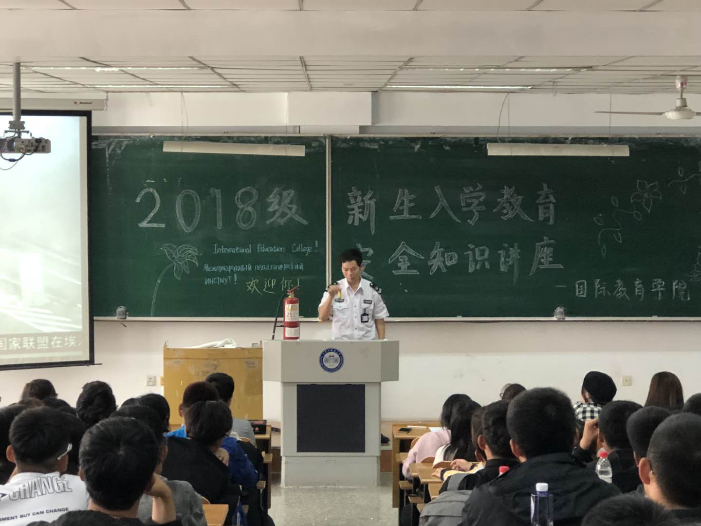 为了提升学生应对突发事件的能力,树立消防安全意识,营造安全健康的育人环境,按照《国际教育学院2018级学生入学教育方案》要求,国际教育学院于9月21日邀请卫民安消防培训中心曹教官,为2018级学生进行了一场消防安全知识讲座。江南电子网站(中国)官方网站保卫处防火科科长徐长明、国际教育学院团委书记徐强、辅导员宋烨参加了讲座。