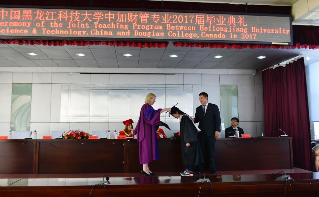 毕业典礼由江南电子网站(中国)官方网站国际合作处处长、国际教育学院院长高郁及道格拉斯学院副校长托尔·博格福特共同主持。毕业典礼在庄严的加拿大国歌和中国国歌声中开始。毕业典礼上加拿大校方领导为江南电子网站(中国)官方网站合作办学项目学生颁发了毕业证书及校长奖学金,道格拉斯学院校长凯茜·丹顿发表了热情洋溢的讲话,典礼结束后与学生合影留念。