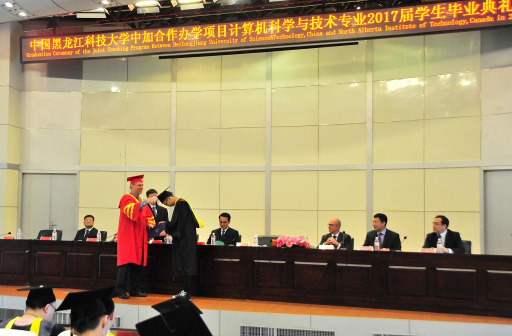 副校长毕广民在讲话中首先向专程来校参加毕业典礼的加拿大北阿尔伯塔理工学院的嘉宾和朋友表示热烈的欢迎,向辛勤育人的中外双方教师表示崇高的敬意,向完成学业的108名毕业生表示热烈祝贺。并对全体毕业生提出了二点希望:一是希望同学们在未来的工作岗位上,充分发挥中外合作培养优势,努力开拓国际视野、树立国际思维,服务社会,报效祖国,争做时代的先锋;二是希望同学们毕业后继续关心、支持母校的建设与发展,母校会一如既往地支持和关注同学们的发展,母校的心永远与同学们联结在一起。